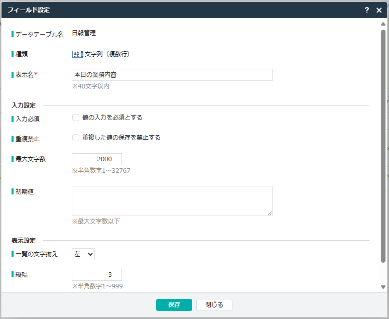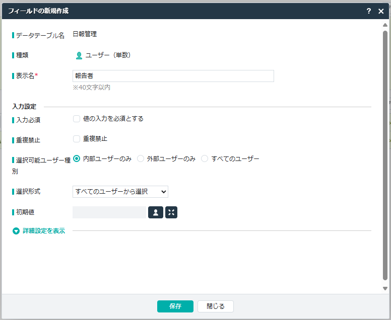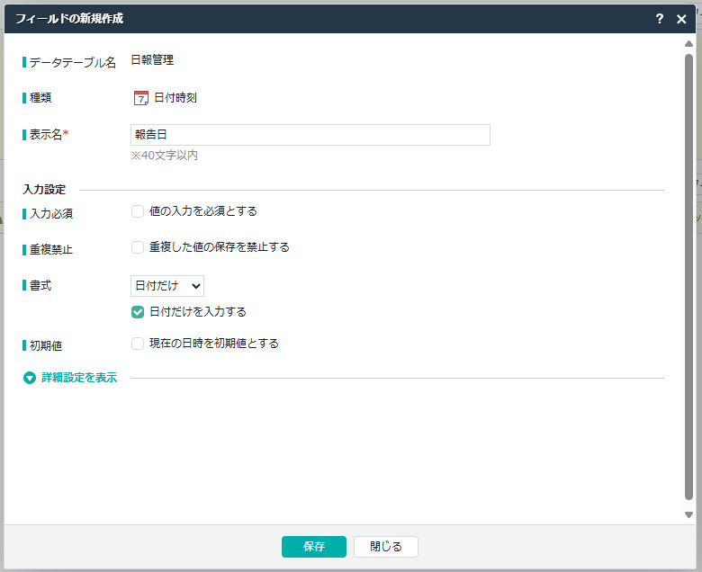 b.フィールド名を「報告日」にし、形式を「日付だけ」にします。設定が終わったら「保存」を押しましょう。