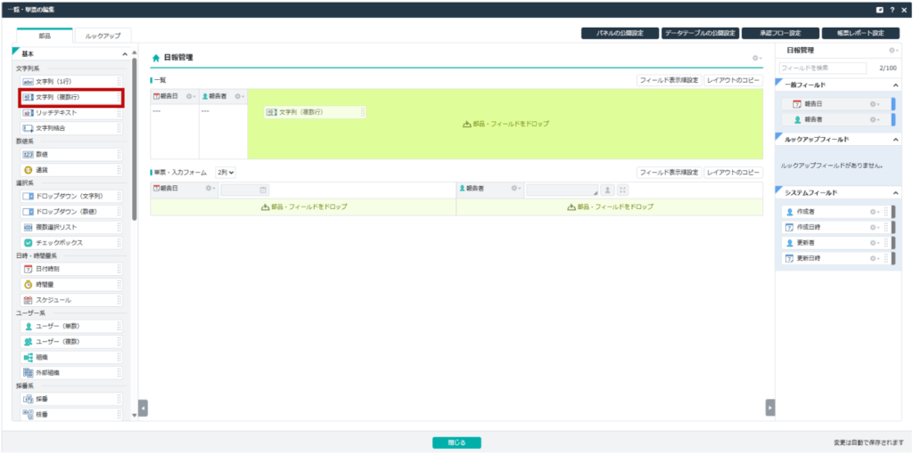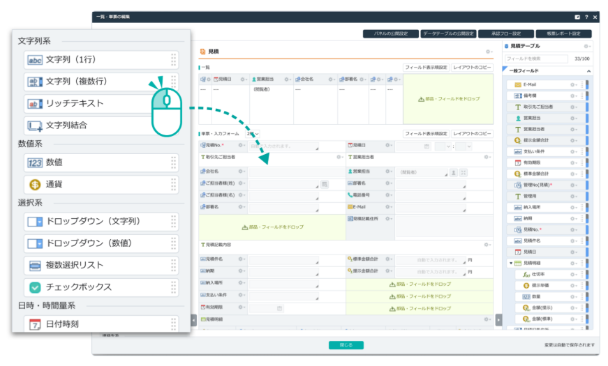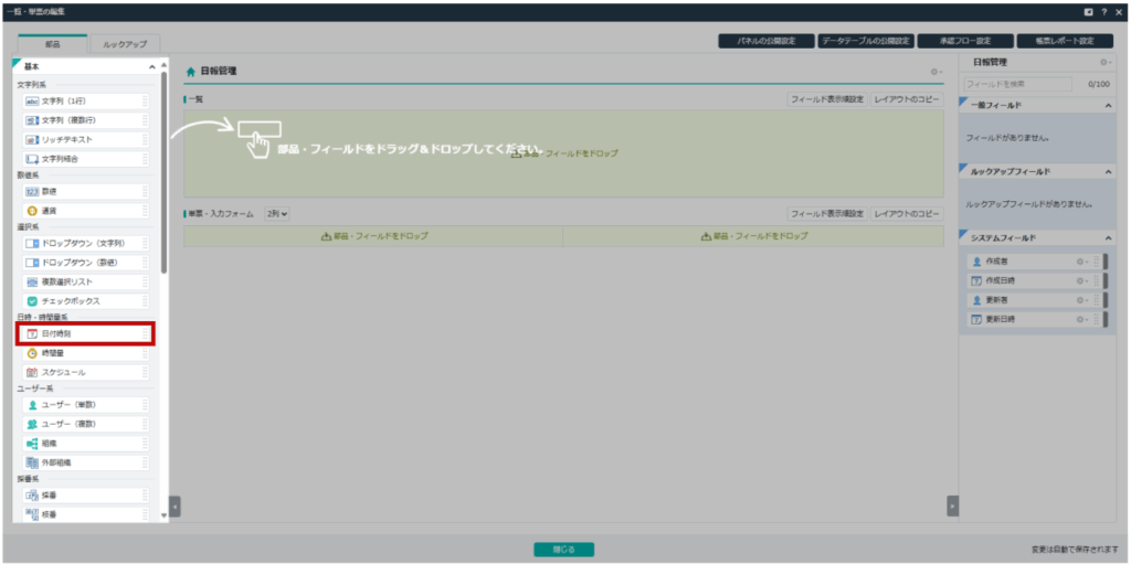 ③パネルの構築画面が開きます。必要な「フィールド」(データの入力欄となるハコ)を左からドラッグ&ドロップで配置しましょう。