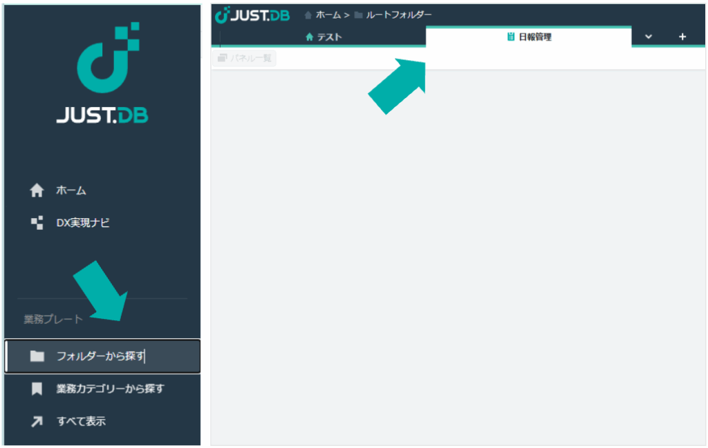 💡作成した業務プレートへは、ログイントップ画面のフォルダー、業務カテゴリーから遷移できます。また、タブの切り替えでも表示可能です。