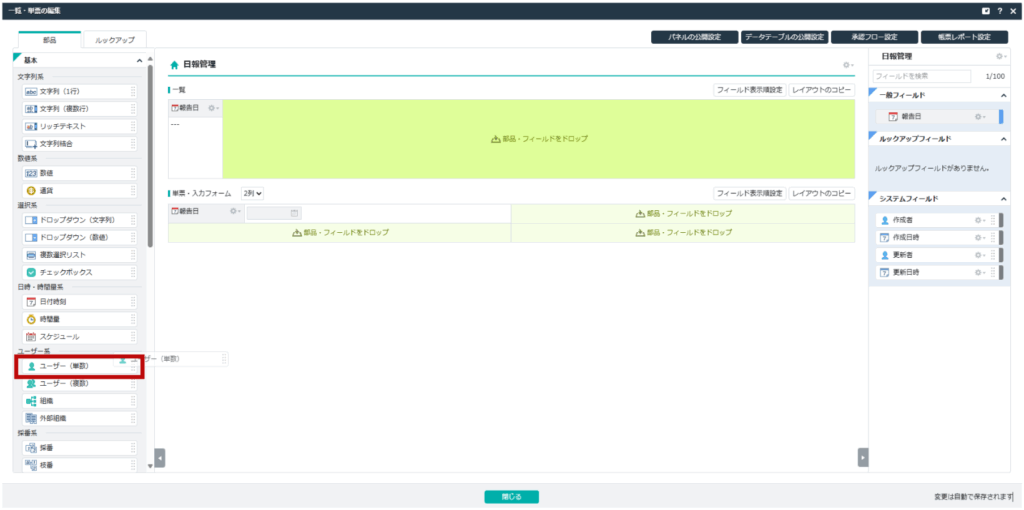 c.次に、「ユーザー選択(単数)」フィールドを配置します。