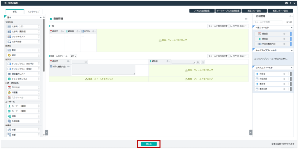 ④フィールドの配置が完了したら、「閉じる」をクリックしてパネルの設定を保存します。