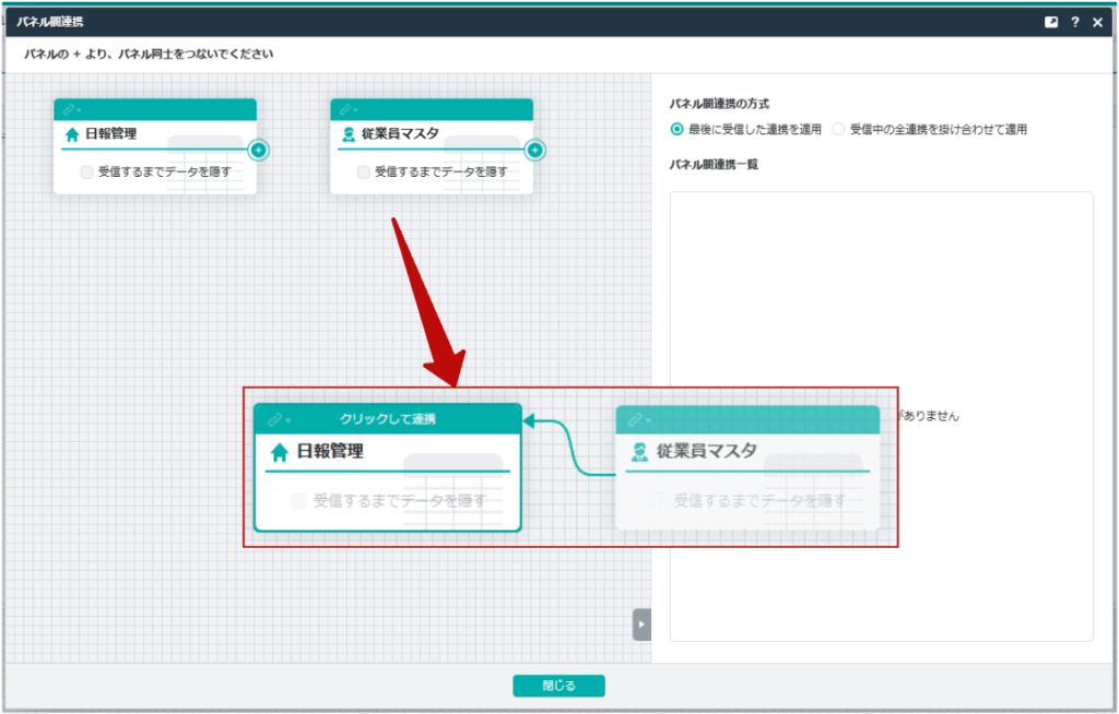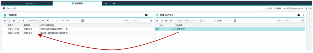 「日報管理」業務プレートに、「従業員マスタ上で従業員をクリックすると、その従業員の日報が絞り込まれて表示される」パネル間連携を設定してみましょう。