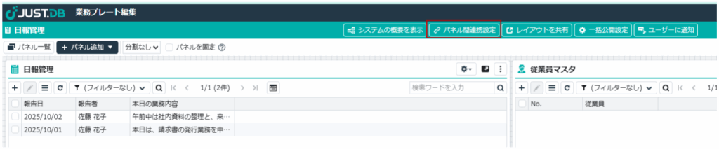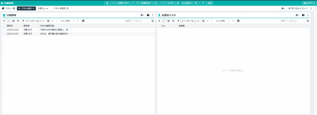 ②「従業員マスタ」パネルを作成し、「日報管理パネル」と並べて配置します。