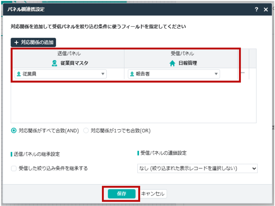 ⑤連携のキーの設定画面が開きます。ここでは、従業員をキーにしたいので、「従業員マスタ」側では「従業員」、「日報管理」側では「報告者」を選択し、「保存」を押しましょう。