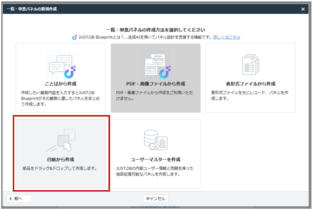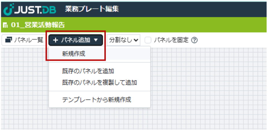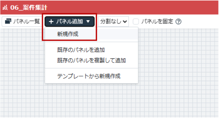 ②「+パネル追加」ボタンをクリックして、「新規作成」を選択します。ここでは、「白紙から作成」をしてみましょう。