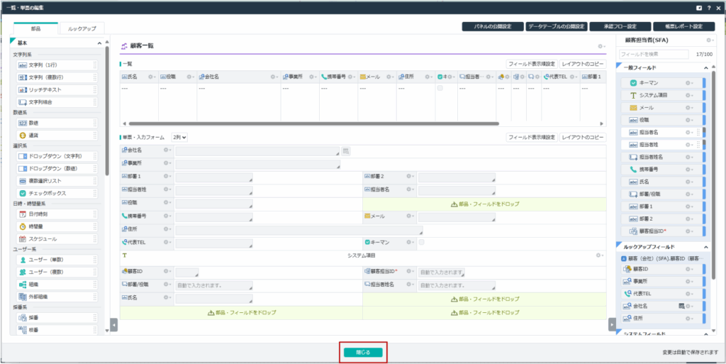 ③必要な「フィールド」(データの入力欄となるハコ)を左からドラッグ&ドロップで配置しましょう。フィールドの配置が完了したら、「閉じる」をクリックしてパネルの設定を保存します。