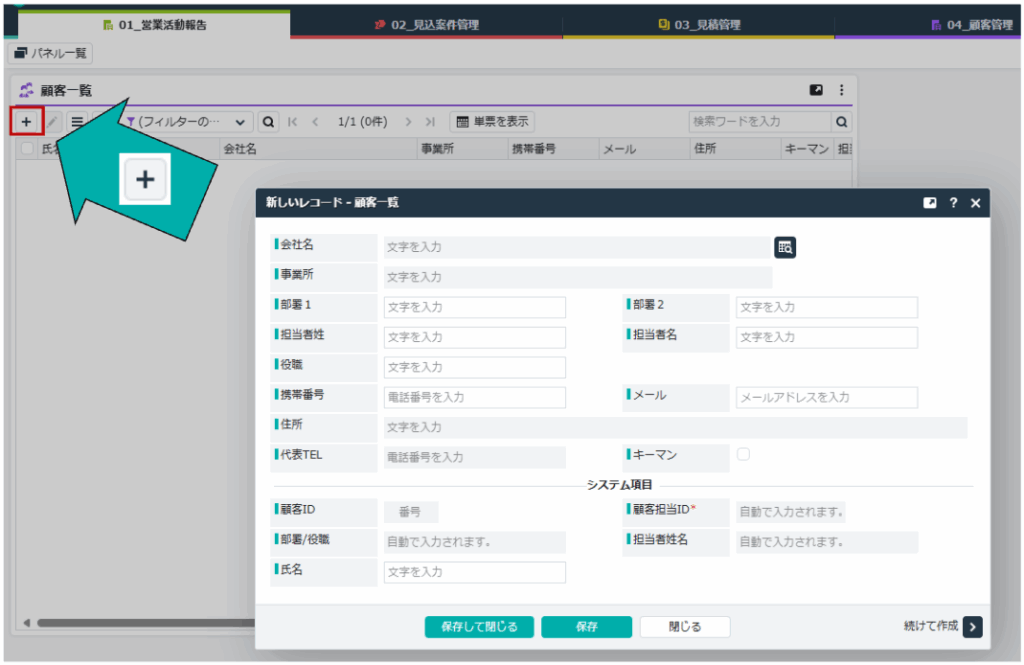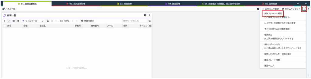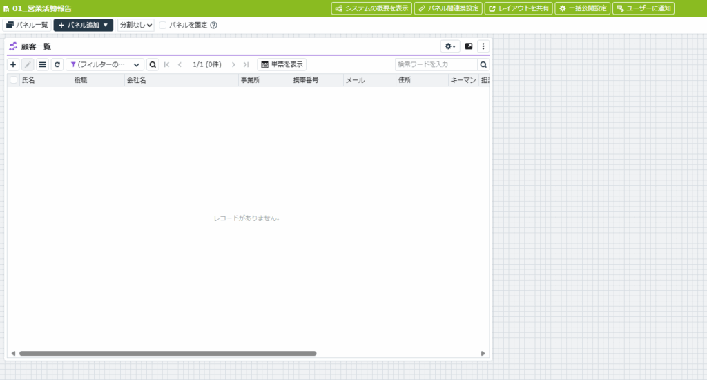 ⑤業務プレートの編集を終了し、「+」より作成したパネルに、顧客一覧を入力して管理することができます。