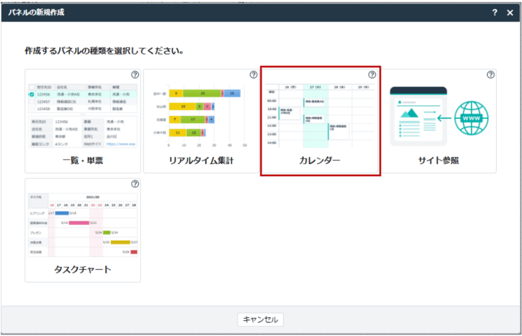 ②「+パネル追加」ボタンをクリックして、「新規作成」を選択します。そして、「カレンダー」を選択しましょう。