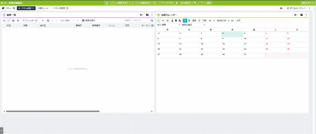通常のカレンダーパネルとは異なり、営業活動の「計画」と「実績」を同時に管理できるのが特徴です。