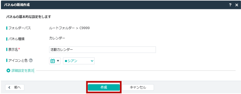 ③パネルの表示名を「活動カレンダー」とし、「作成」を押しましょう。