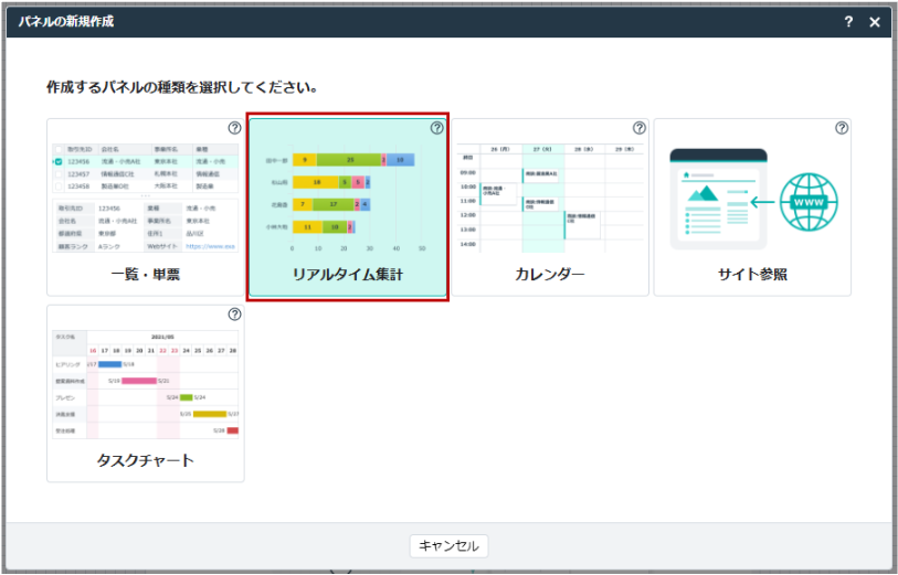 ②「+パネル追加」ボタンをクリックして、「新規作成」を選択します。そして、「リアルタイム集計」を選択しましょう。