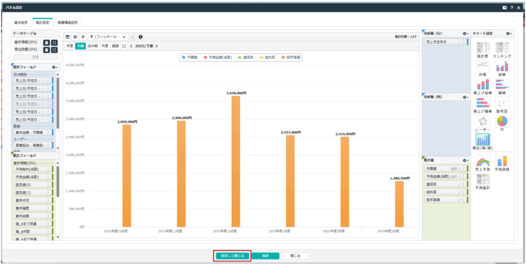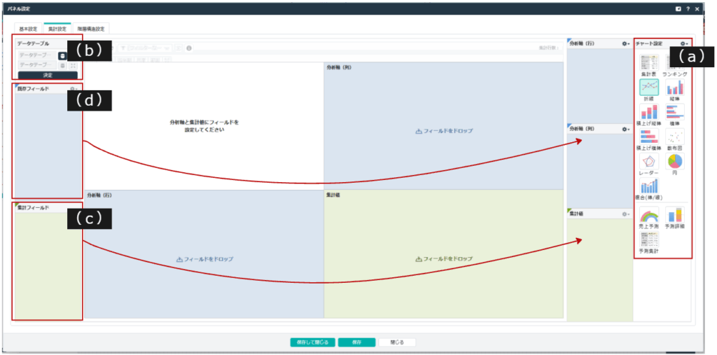 (d)「既存フィールド」から、行方向または列方向の分析軸に使用するフィールドをドラッグして、ピボットテーブルの「分析軸(行)」または「分析軸(列)」のエリアにドロップします。配置が完了したら、「保存して閉じる」をクリックしてパネルの設定を保存します。