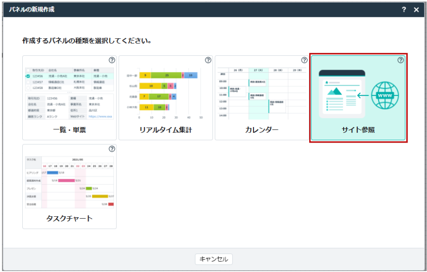 ②「+パネル追加」ボタンをクリックして、「新規作成」を選択します。そして、「サイト参照」を選択しましょう。