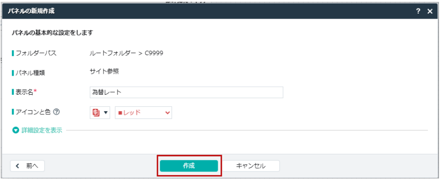 ③パネルの表示名を「為替レート」とし、「作成」を押しましょう。