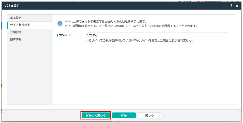 ⑤「サイト参照設定」タブで、参照先URLを入力し、「保存して閉じる」を押しましょう。