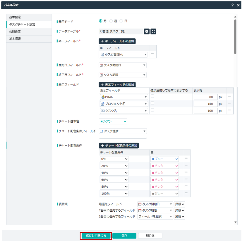 ⑤「タスクチャート設定」タブで、必要な項目を設定し、「保存して閉じる」を押しましょう。