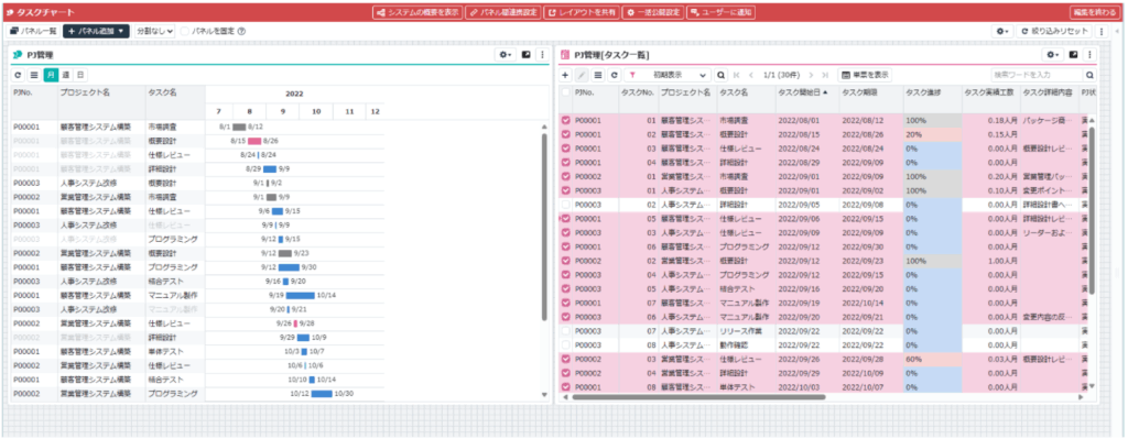 タスクチャートパネルは、タスクや工程の開始日・終了日をガントチャート形式で表示するパネルです。一覧・単票パネルと連携して使用します。