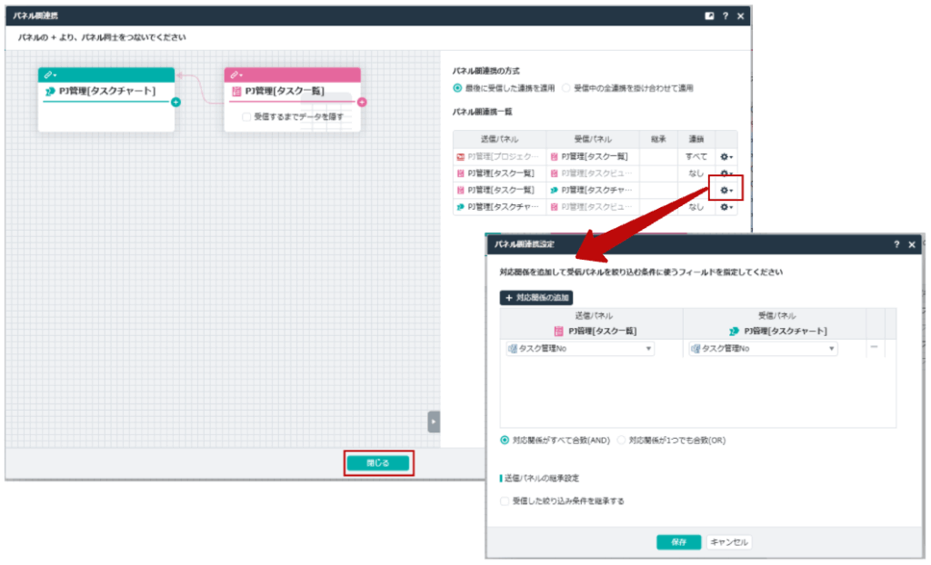 ⑦プレート上部の「パネル間連携設定」をクリックし、パネル間連携設定を開きます。パネル横の「+」より、パネルをつなげ、対応関係の設定に使うフィールドを指定しましょう。紐付けが終わったら「閉じる」を押して設定を反映させましょう。