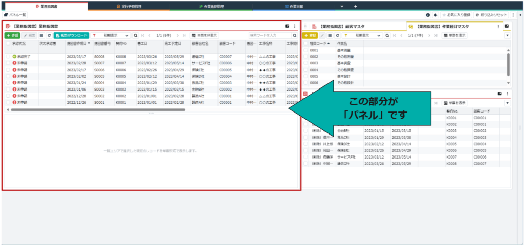 これらのパネルは同じデータテーブルを参照しているので、一箇所でデータを更新すると、関連するすべてのパネルに反映されます。データの整合性を保ちながら、効率的に情報管理ができるのが大きな特徴です。