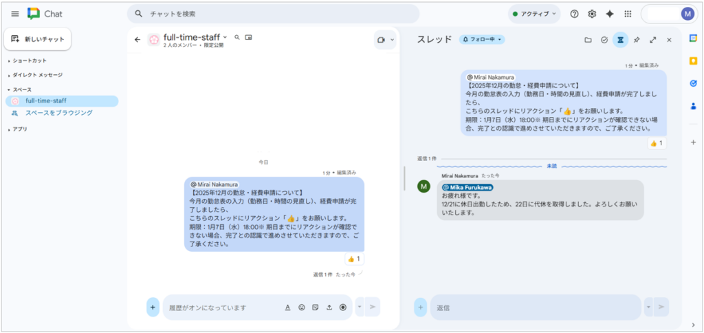 従来の社内連絡はメールか電話が中心でしたが、Google チャットを使えば、メールによる「記録」、電話の「早さ」の両方のメリットを享受できます。