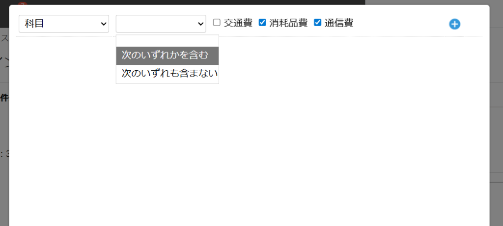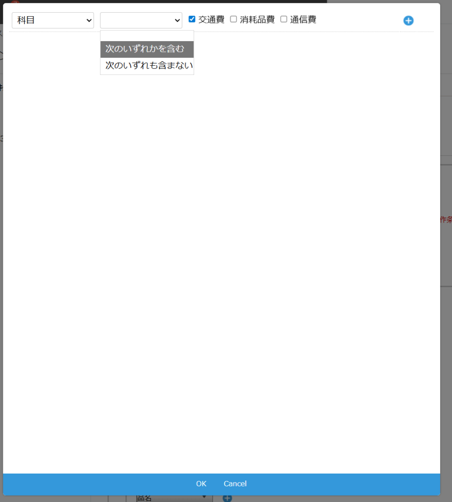 3.下図のような画面が表示されるので、「科目」「次のいずれかを含む」「交通費」を選択し、OKを押す
