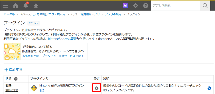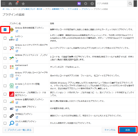 8.「kintone条件分岐処理プラグイン」にチェックを入れ、「追加」ボタンをクリック