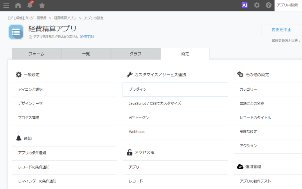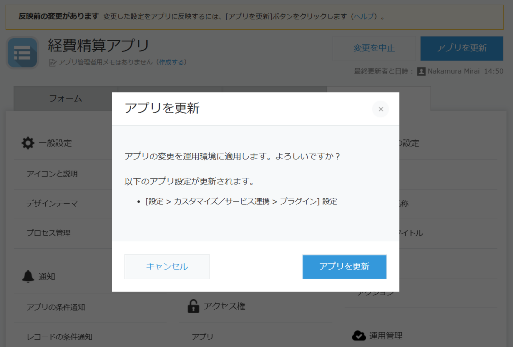 4.プラグインを読み込む対象のアプリを開く(今回は「経費精算アプリ」を使用します)